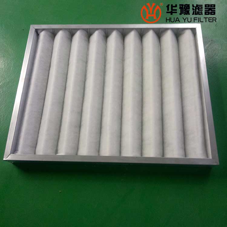 過濾材料是以折疊形式裝入高強度模且硬紙板內,迎風面積增大,流入空氣中的塵埃粒子被過濾材料有效阻擋在褶與褶之間,潔凈空氣從另一面均勻流出,因此氣流通過過濾器是平緩和均勻的。